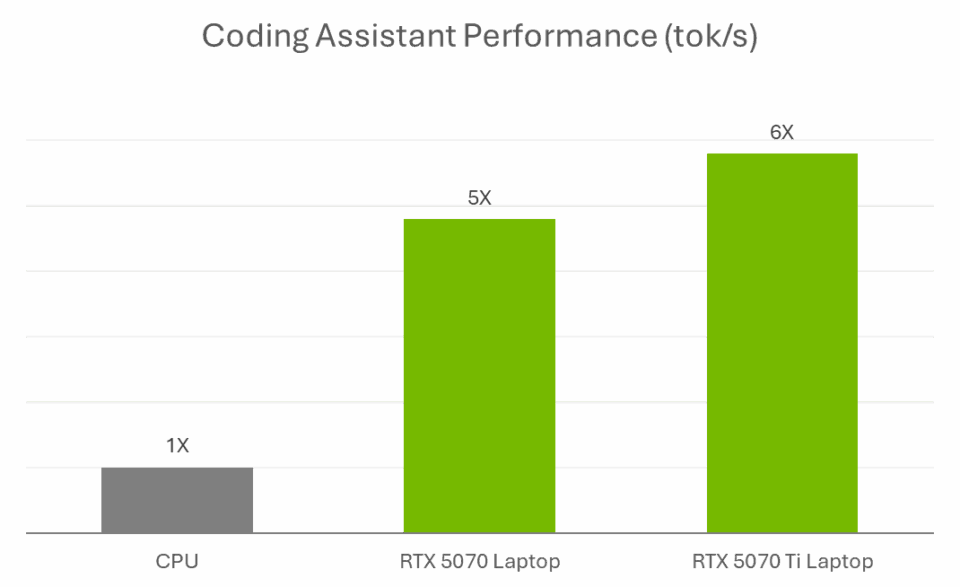 このレベルの応答性は、GPU アクセラレーションに依存しています。 Gemma 12B のようなモデルは、特に長いプロンプトを処理したり、複数のファイル間で作業する場合、計算負荷が高くなります。 ローカル環境で GPU なしで実行すると、簡単なタスクであっても遅く感じることがあります。RTX GPU により、Tensor コアはデバイス上で直接推論処理を高速化します。そのため、アシスタントは高速かつ応答性が高く、アクティブな開発ワークフローに追いつくことができます。